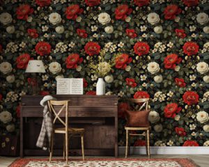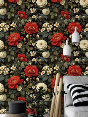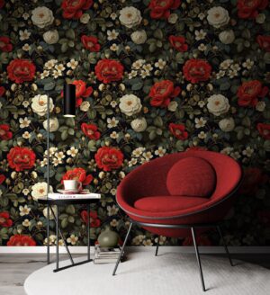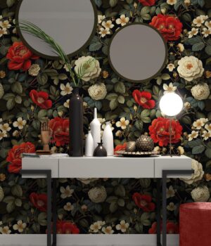Koyu siyah zemin üzerine yerleştirilmiş kırmızı ve krem tonlarındaki büyük çiçeklerle zenginleştirilmiş bu duvar kağıdı, klasik ve çarpıcı bir atmosfer yaratır. Vintage ve sofistike dekorasyon stilleriyle mükemmel uyum sağlar. Antre, yemek odası, otel odası veya özel tasarımlı iç mekanlarda etkileyici bir vurgu yaratmak için idealdir. Ürün, kendinden yapışkanlı ve geleneksel tutkal uygulamalı seçeneklerle sunulmaktadır.