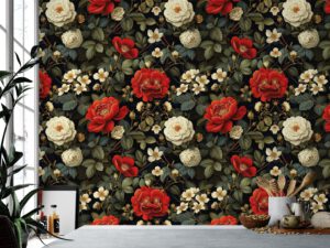 Siyah Zemin Üzerine Kırmızı ve Krem Çiçekli Duvar Kağıdı