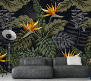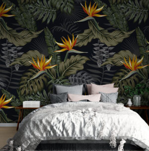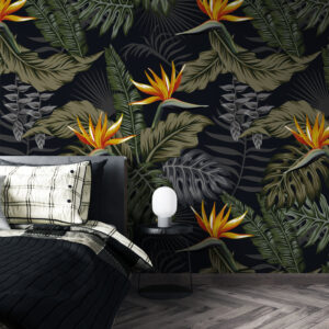 Gece gibi siyah fon üzerinde canlı strelitzia çiçekleri ve tropikal yapraklar bu duvar kağıdını modern ve etkileyici kılar.