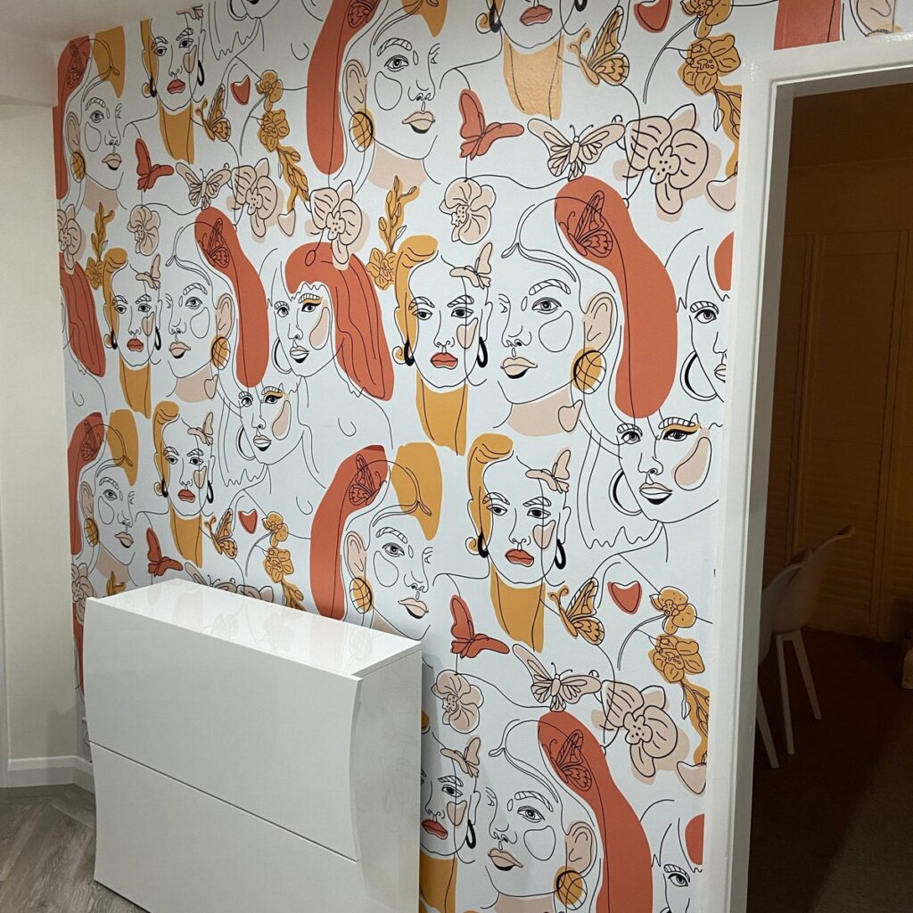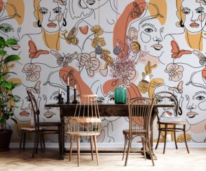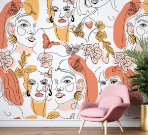 Soyut kadın yüzlerinden oluşan bu modern sanat duvar kağıdı, zarif çizgiler ve pastel tonlardaki çiçek motifleriyle yaşam alanlarınıza sanatsal bir dokunuş katıyor. Turuncu, sarı ve pembe tonlarındaki detaylarla sıcak ve enerjik bir atmosfer yaratır.