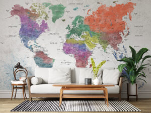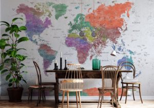 Su bazlı suluboya dokusuyla tasarlanmış, pastel ve canlı renklerin özgün geçişleriyle dikkat çeken bu dünya haritası duvar kağıdı, mekânınıza adeta bir sanat galerisi atmosferi katar. İnce ülke sınırları ve net şehir yazıları yüksek çözünürlüklü UV baskıda sunulur ve uzun ömürlü canlılık sağlar.