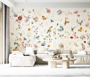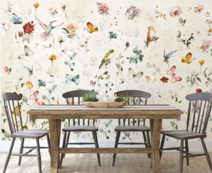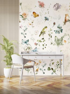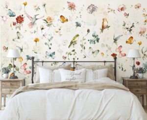 Suluboya Kuş, Çiçek ve Kelebek Desenli Duvar Kağıdı