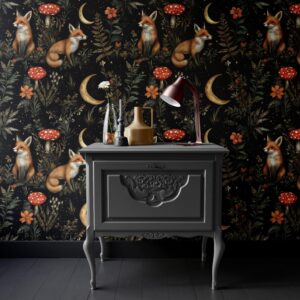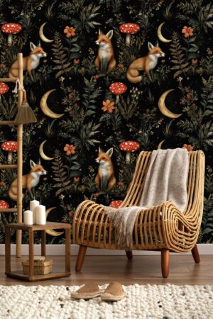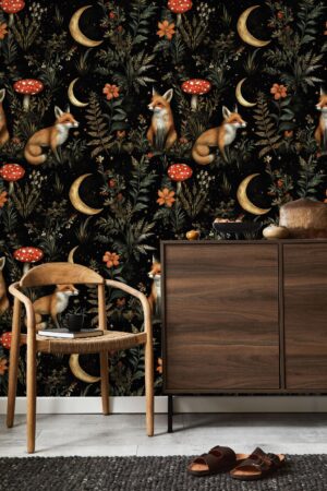 Tilki Mantar Ay Desenli Koyu Orman Duvar Kağıdı