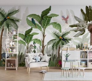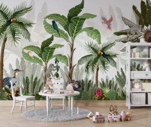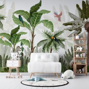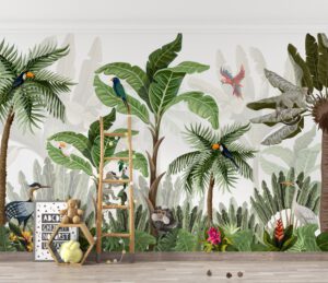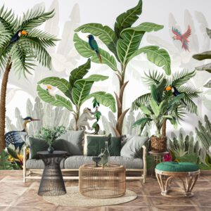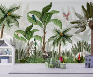 Maymunlar, papağanlar ve yemyeşil bitkilerle süslenmiş bu duvar kağıdı, çocuk odalarına eğlenceli ve canlı bir atmosfer kazandırır.