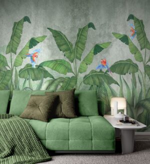Tropikal Kuşlar ve Muz Yaprakları Duvar Kağıdı
