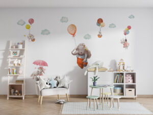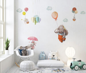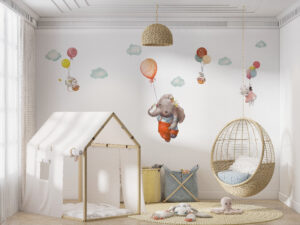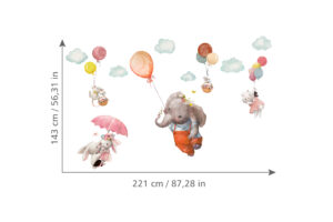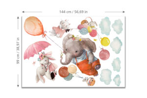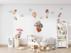 Bu eşsiz duvar sticker seti ile çocuk odalarını sihirli bir gökyüzü macerasına dönüştürün! Balonuyla süzülen sevimli fil, şemsiyesiyle uçan tavşan ve balon sepetlerinde yolculuk eden minik fareler… Bu hayalperest tasarım, çocukların odasına neşe ve harikalar diyarı atmosferi katacak. Yumuşak suluboya çizimleri ve pastel tonları, her türlü oda dekorasyonuyla mükemmel bir uyum sağlar.