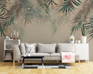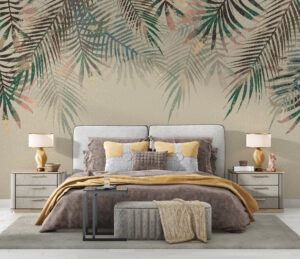 Yumuşak bej zemin üzerine solgun pastel tonlarda palmiye yapraklarıyla tasarlanan bu duvar kağıdı, yatak odanıza huzurlu ve sıcak bir atmosfer kazandırır.
