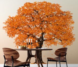 Geniş turuncu yapraklarıyla sıcak bir sonbahar ağacını betimleyen bu duvar kağıdı, huzurlu ve doğal bir atmosfer oluşturur. Yatak odasında dinginlik sağlar, terapi odalarında sakinleştirici etki yaratır. Yoga stüdyosu veya doğa temalı butik otel dekorasyonlarında da estetik bir odak noktasıdır.
