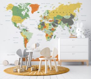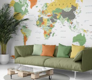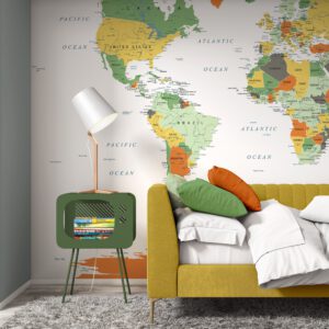 Canlı yeşil, turuncu ve sarı tonlarının doğal bir palet oluşturduğu bu politik dünya haritası duvar kağıdı; salon, ofis, çalışma odası ve kütüphanelere ferah, enerjik ve modern bir dokunuş katar. Ülkeler net sınırlarla belirtilmiş, şehir adları okunaklı yazı tipleriyle yüksek çözünürlüklü UV baskıda sunulmuştur.