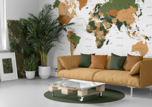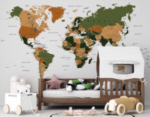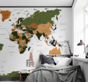 Doğal yeşil ve toprak tonları ile tasarlanmış bu dünya haritası duvar kağıdı, mekanlarınıza sıcak ve huzurlu bir atmosfer kazandırır. Ülkeler ve şehirler detaylı şekilde gösterilmiştir. Kendinden yapışkanlı vinil veya tutkallı geleneksel malzeme seçenekleri ile kolayca uygulanabilir. Salonlar, ofisler, çalışma odaları, kütüphaneler ve doğa temalı mekanlar için idealdir. Yüksek çözünürlüklü baskı kalitesi sunulmakta ve isteğe özel ölçü üretim yapılmaktadır.