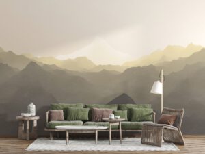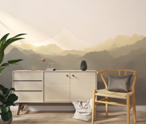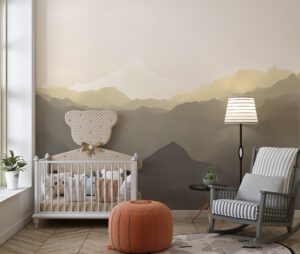 Bu yumuşak tonlardaki dağ manzaralı duvar kağıdı, çocuk odasına huzur dolu bir atmosfer katarken modern bir dekoratif dokunuş ekler.