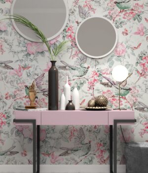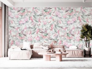 Evinize zarafet ve nostaljik bir hava katacak bu göz alıcı vintage çiçek ve kuş desenli duvar kağıdı ile tanışın. Açık renkli fon üzerine işlenmiş narin pembe çiçekler, zarif yeşil ve teal tonlarındaki kuş figürleri ve yumuşak yeşil yapraklarla bezenmiş bu tasarım, mekanlarınıza sofistike ve romantik bir dokunuş getirecek. Chinoiserie esintileri taşıyan bu desen, duvarlarınızı adeta sanatsal bir bahçeye dönüştürür; salonunuz, yatak odanız veya giriş holünüz için mükemmel bir seçimdir.